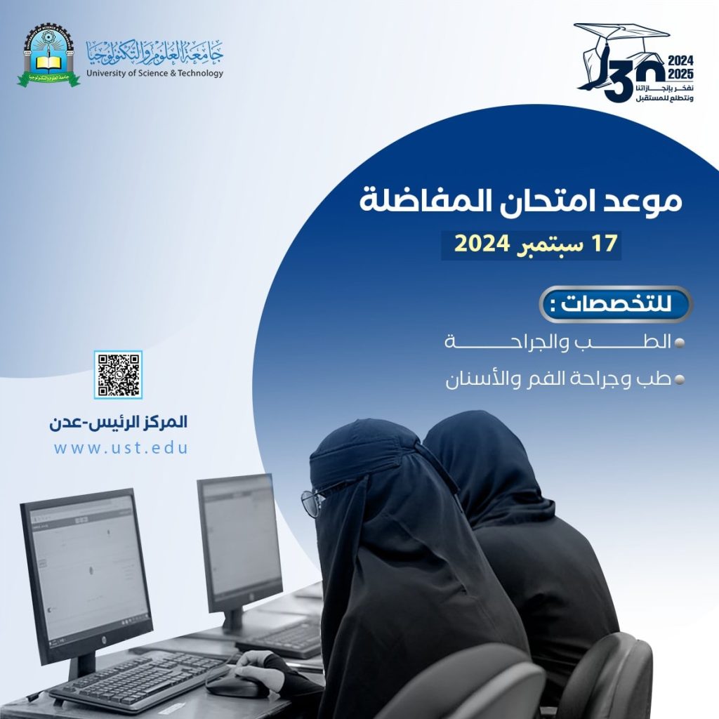 تعلن جامعة العلوم والتكنولوجيا – المركز الرئيس عدن لطلبتها الأعزاء المسجلين في برنامجَي “الطب والجراحة” و “طب وجراحة الفم والأسنان” أن موعد امتحان المفاضلة سيكون يوم الثلاثاء الموافق 17 سبتمبر 2024.