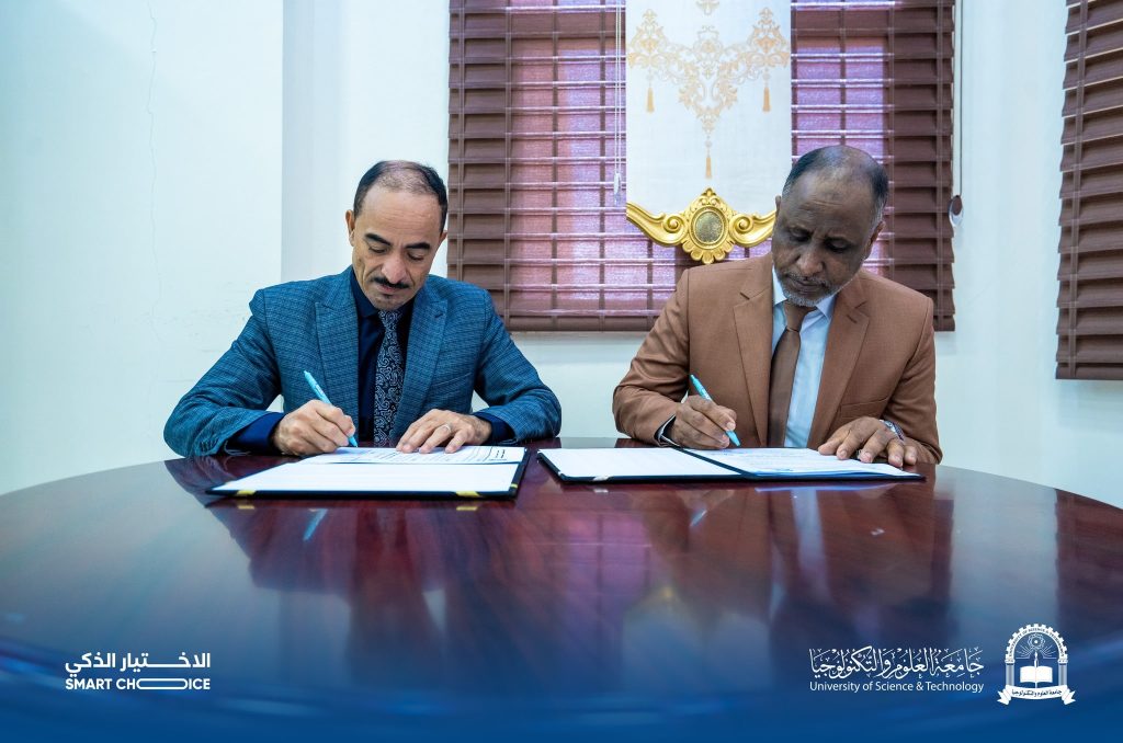 وقع القائم بأعمال رئيس جامعة العلوم والتكنولوجيا الأستاذ الدكتور عبد الغني حميد أحمد ونائب رئيس جامعة المهرة للشؤون الأكاديمية الدكتور فائز جمعان خميس بن مركب مذكرة تعاون مشترك بين الجامعتين.