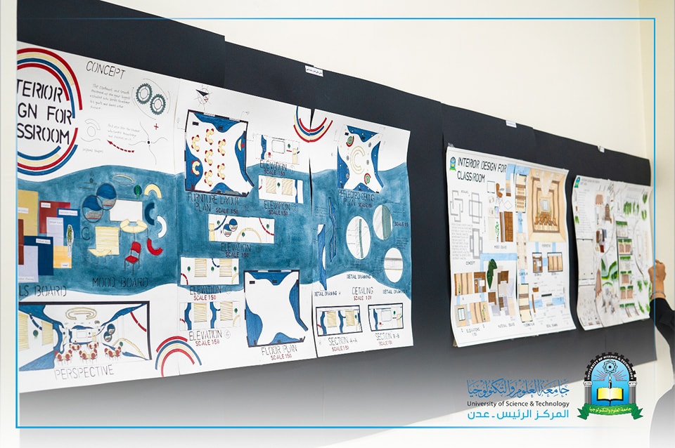 The exhibition was held in the College of Engineering building at the University of Science and Technology, including designs for classrooms, under the supervision of Dr. Abdul Nasser Al-Qadri and Eng. Hanin Rushdi.