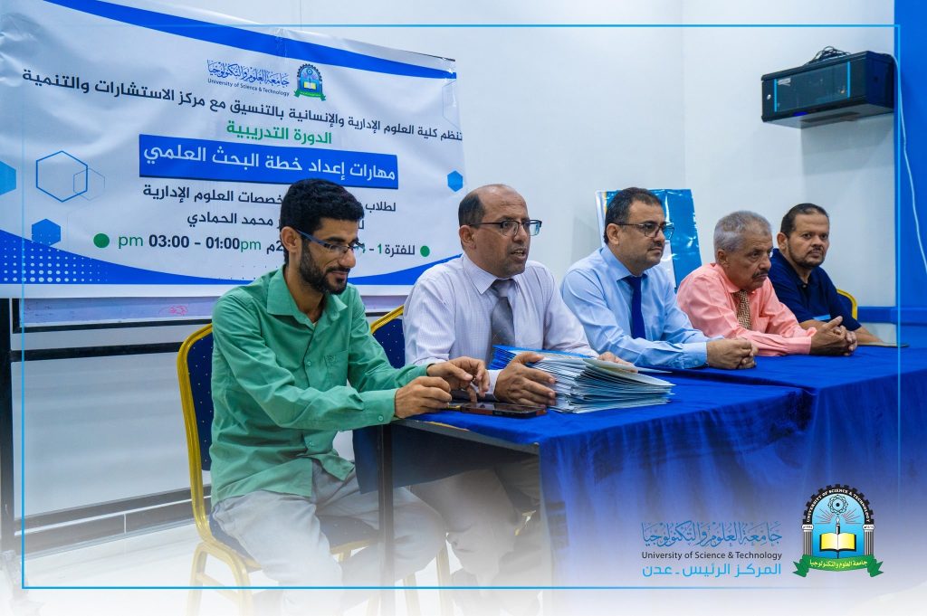 Kursus pelatihan “Keterampilan Mempersiapkan Rencana Penelitian Ilmiah” telah selesai, yang diselenggarakan oleh Sekolah Tinggi Administrasi dan Ilmu Pengetahuan Manusia di Universitas Sains dan Teknologi - Pusat Utama Aden, berkoordinasi dengan Pusat Konsultasi dan Pengembangan Universitas.