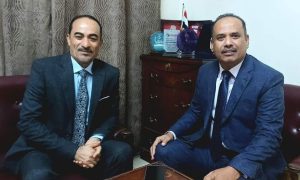 Profesor Dr. Abdul-Ghani Hamid Ahmed, Penjabat Presiden Universitas Sains dan Teknologi, Pusat Utama - Aden, bertemu dengan Profesor Dr. Hadi Al-Sabban, Penasihat